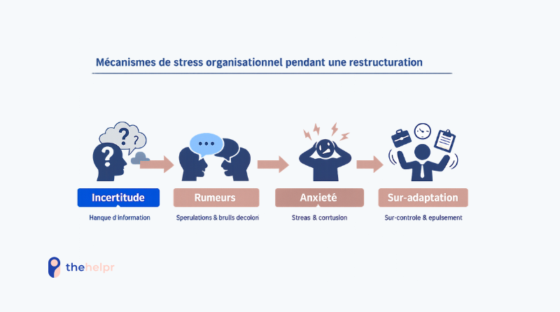 C’est ainsi que se met en place ce que beaucoup décrivent ensuite comme une “usine à interprétations” : chaque mot devient un indice, chaque changement de posture une preuve, chaque absence d’information une confirmation. Cette dynamique a des effets très concrets : stress organisationnel, perte de repères identitaires, hypervigilance, ruminations, baisse de concentration, et fragilisation du lien social. Elle pèse particulièrement sur les managers, qui doivent simultanément rassurer, exécuter, absorber les tensions et souvent masquer leurs propres incertitudes, au prix d’un travail émotionnel rarement reconnu.