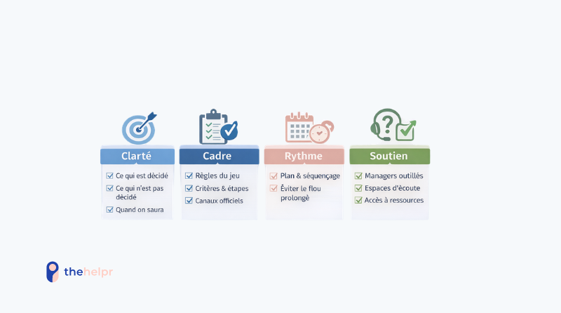 Dans ces situations, quatre leviers reviennent comme des fondamentaux : clarifier les étapes (ce qui est décidé, ce qui ne l’est pas, quand on saura), sécuriser le cadre (règles du jeu, critères, canaux officiels), gérer le rythme (éviter le flou prolongé qui nourrit la rumeur et l’angoisse), et soutenir les relais (managers formés, espaces d’écoute, ressources activables). La lisibilité apaise ; le flou prolongé désorganise durablement.